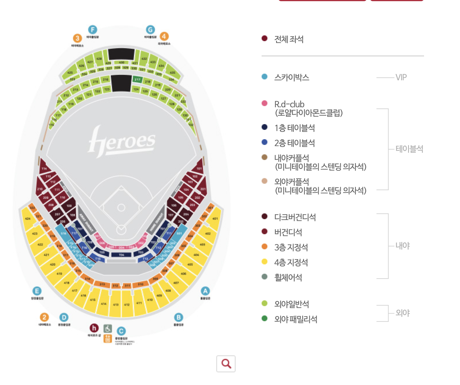 고척돔은 잠실야구장이나 예전 목동구장과는 다르게 3층 지정석과 4층 지정석에서 다크버건디, 버건디석이 보이지 않아요.