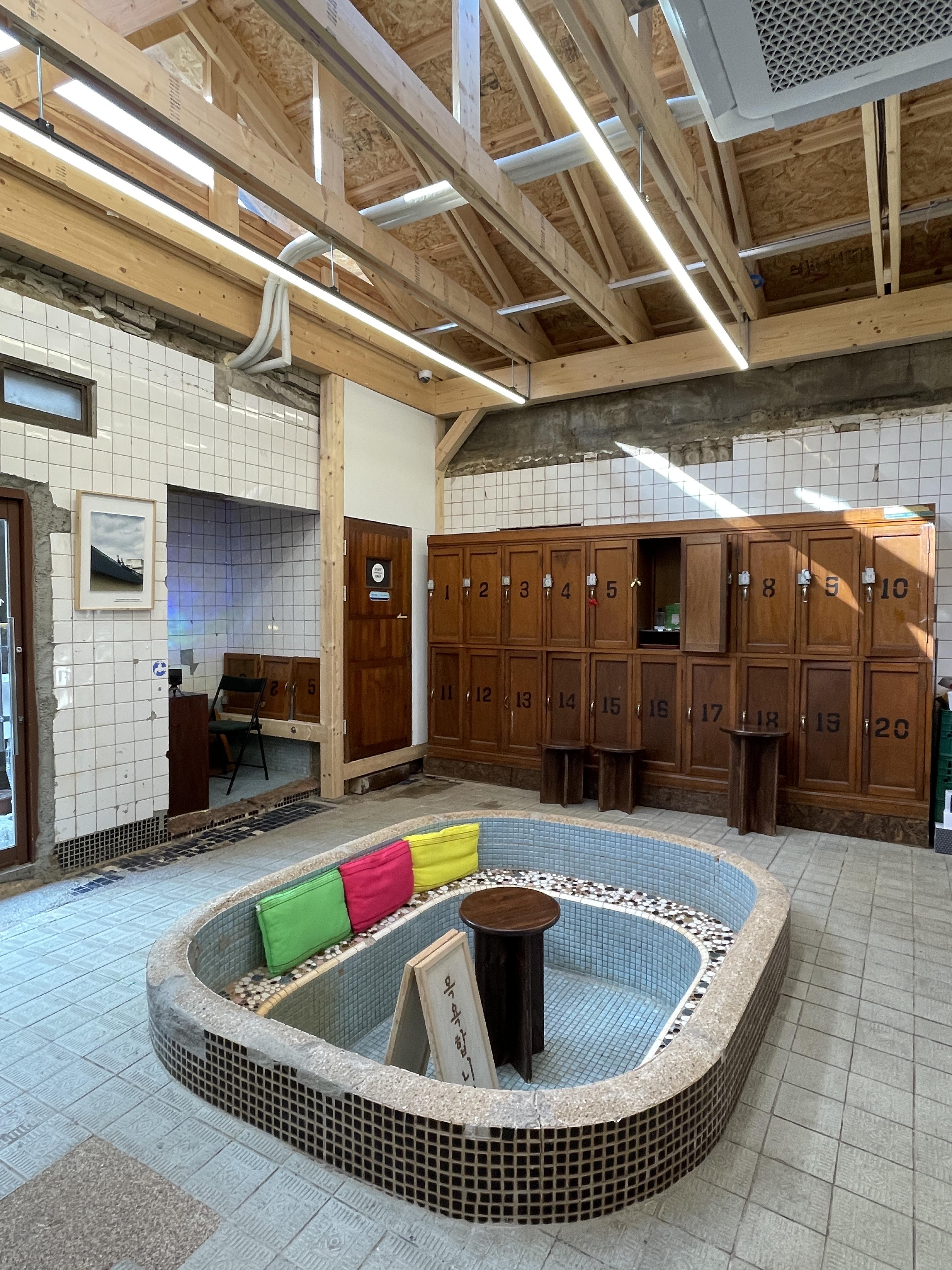 카페 구성의 경우에는 동네 분들의 추억이 가득한 동네 목욕탕의 구조를 그대로 활용해서 동네분들의 추억을 보존했고, 거기에 요즘 감성이 더해진 공간이에요. 온천 명소인 온양에 있는 신천탕 리뉴얼 전에 어린이 때 방문한 기억이 있는데, 그 때 봤던 것과 비슷하게 아주 오래된 목욕탕의 매표소, 그 느낌이 남겨져 있어서 특히나 좋았던 공간이었어요.