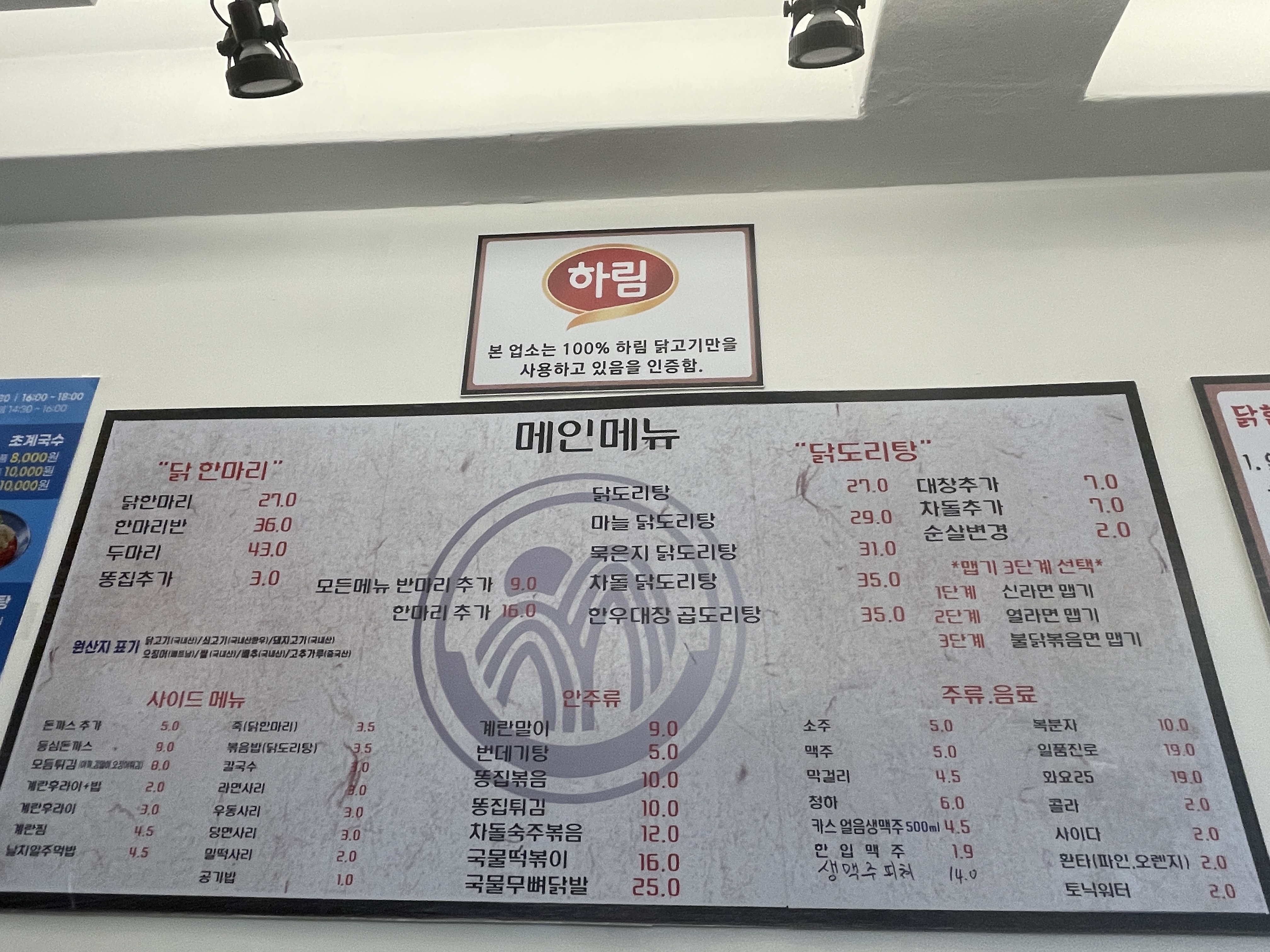 우선 메인 메뉴는 닭한마리와 닭도리탕이 있었고, 점심메뉴로 돈가스를 하는지, 닭한마리/닭도리탕 주문 시, 돈가스도 주시는 것 같았어요!