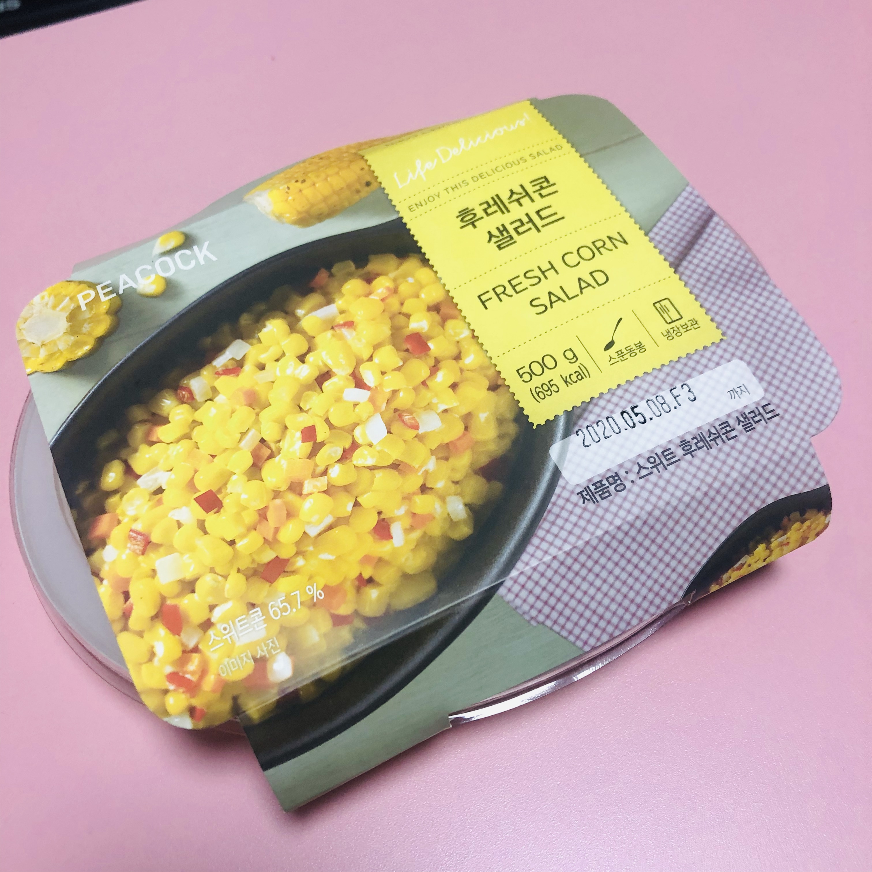 첫 번째로 방문했던 집 근처 편의점은 콘샐러드는 있지만, 알새우칩은 팔지 않았어요. 오랜만에 마음먹고 만들려고 했는데, 이 날은 시도를 포기하게 되었어요. 며칠 후, 이마트에서 장을 보게 되어서 콘샐러드를 찾아 헤맸어요. 편의점에서는 쉽게 찾을 수 있는 이 제품이 대형마트에서는 찾기가 쉽지 않았어요. 직원분들한테 물어봐도 옥수수 통조림 코너로 안내해주셔서 거의 포기할 뻔 했어요. 하지만, 의지의 한국인! 피코크의 '후레쉬콘 샐러드'를 찾게 됩니다! 피코크 만세!