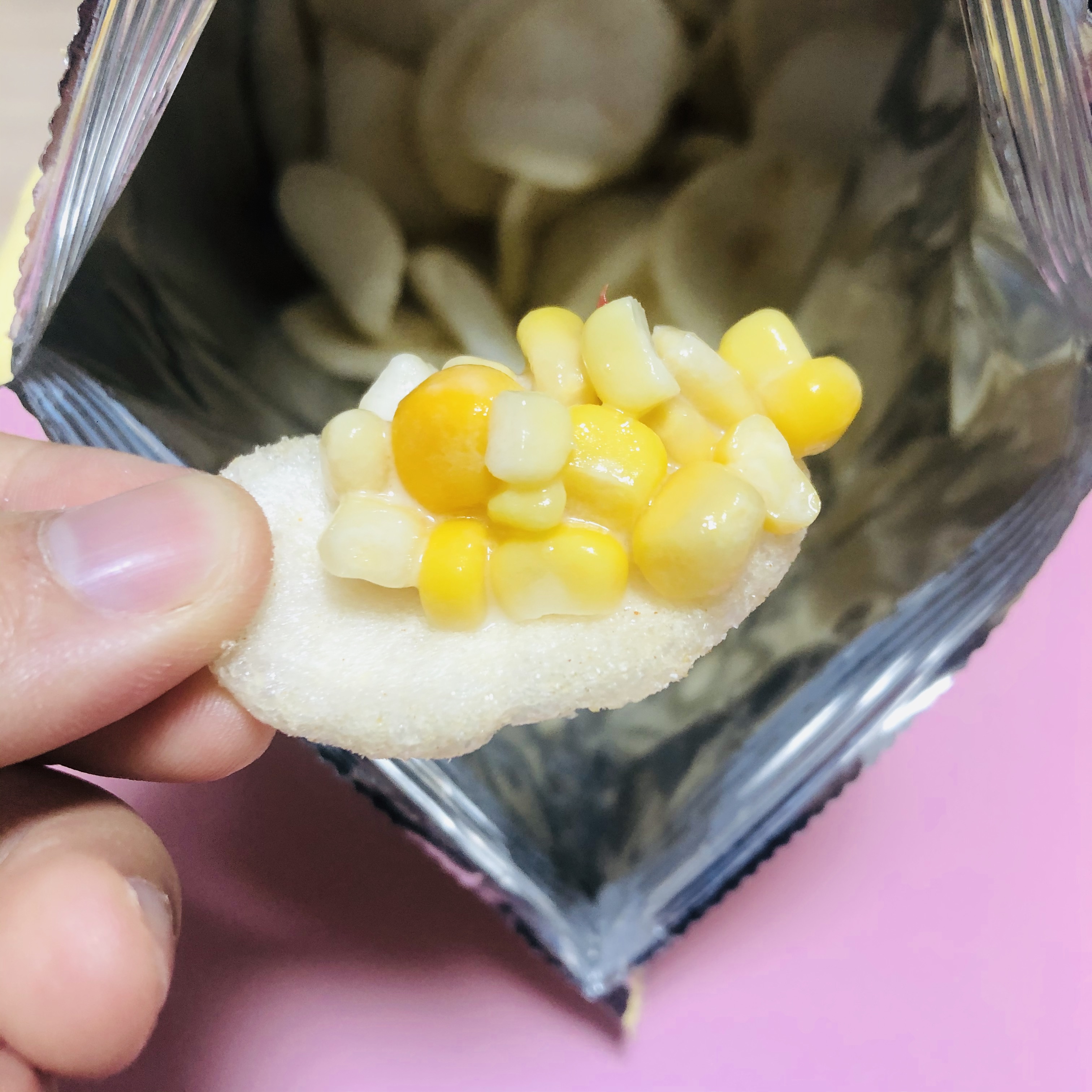 알새우칩을 열어서 콘샐러드를 올리기만 하면, 카나페 완성 끝!