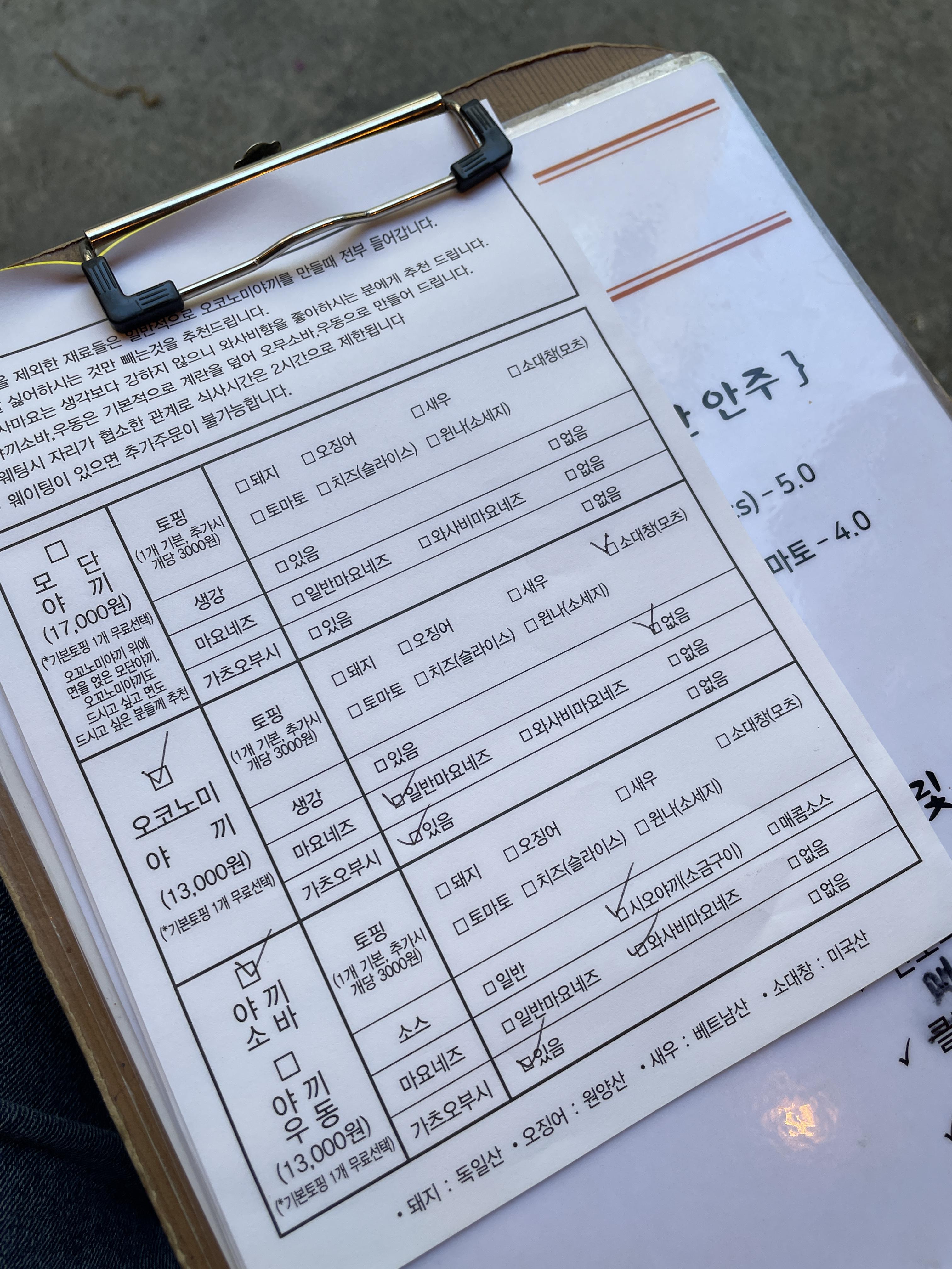 우선 코테츠 웨이팅의 경우, 별도 어플 서비스를 사용중이진 않고, 종이에 이름을 기재하는 방식으로, 호명했을 때 반드시 바로 나타나야하는 시스템이었어요! 대기가 2-3팀 정도 남았을 때, 메뉴판을 주시는데요, 생각보다 체크해야하는 방법이 많고, 조합할 수 있는게 많아서 메뉴 선택이 쉽지 않았어요. 또 워낙 먹는 걸 좋아하다보니, 어떤게 가장 좋은 조합일까도 많이 고민했어요