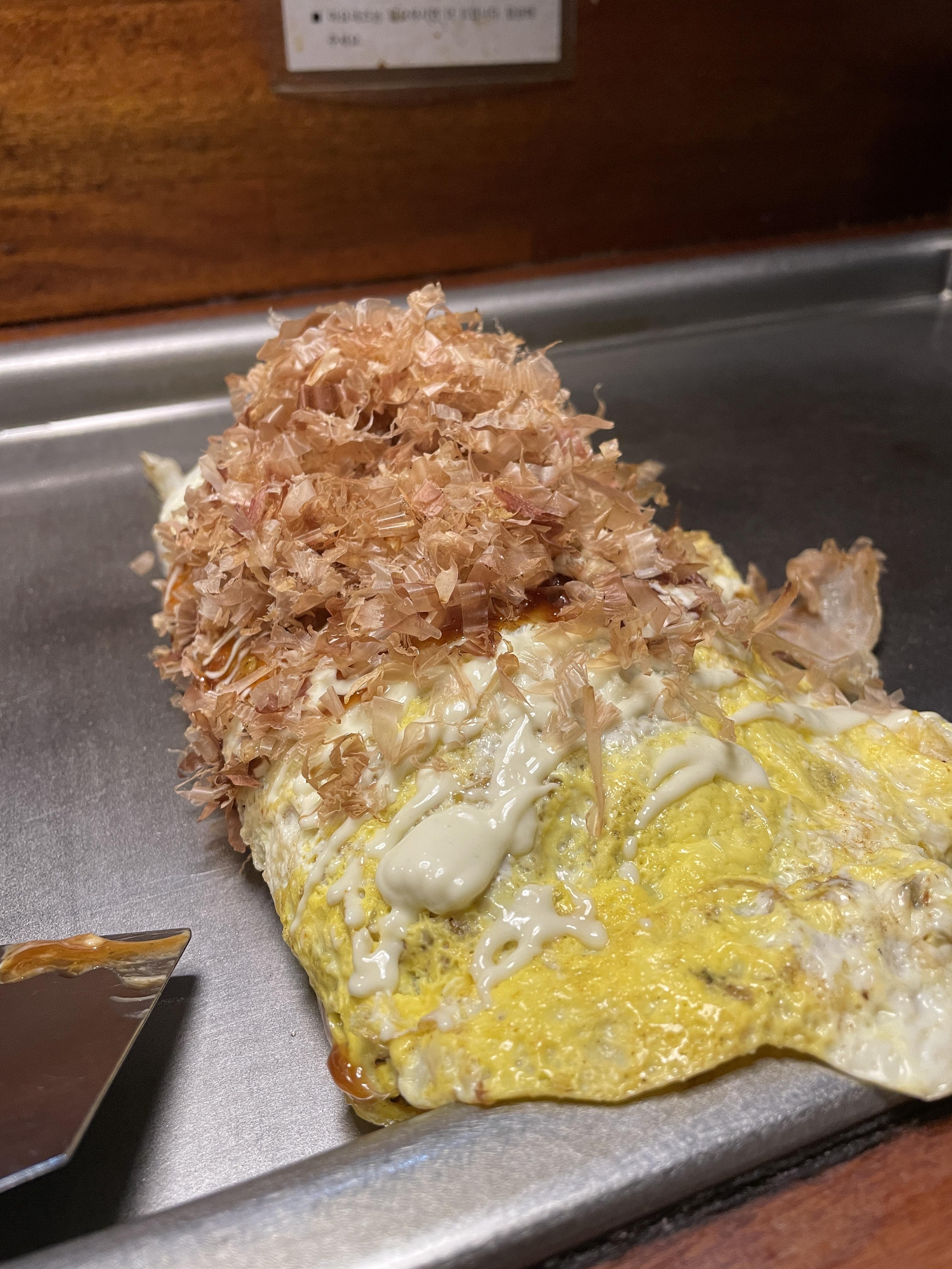 치즈의 풍미가 오꼬노미야끼 맛 전체를 살립니다! 모츠는 꼭 추가하지 않으셔도 될 것 같아요. 모츠가 도톰한 편은 아니고 바싹 익혀지다보니 과자같은 식감이랄까요? 오히려 오징어나 새우 같은 통통한 해산물을 넣으면 더 맛있을 것 같아요