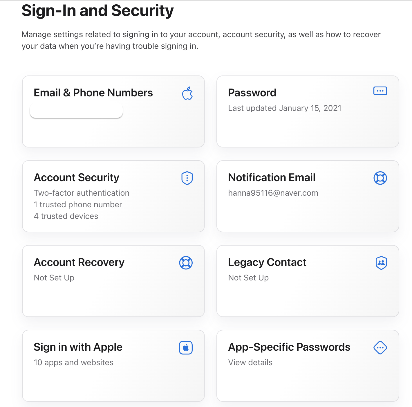 약 2년 반 전에 인스타그램 2단계 인증 해제 안되어서 엄청난 고생을 했던터라, icloud 2단계 인증에는 다행히도 기존 기기 뿐 아니라, 내 휴대폰 전화번호로도 문자가 올 수 있게 2단계 인증 방법을 여러개를 골라두었다.