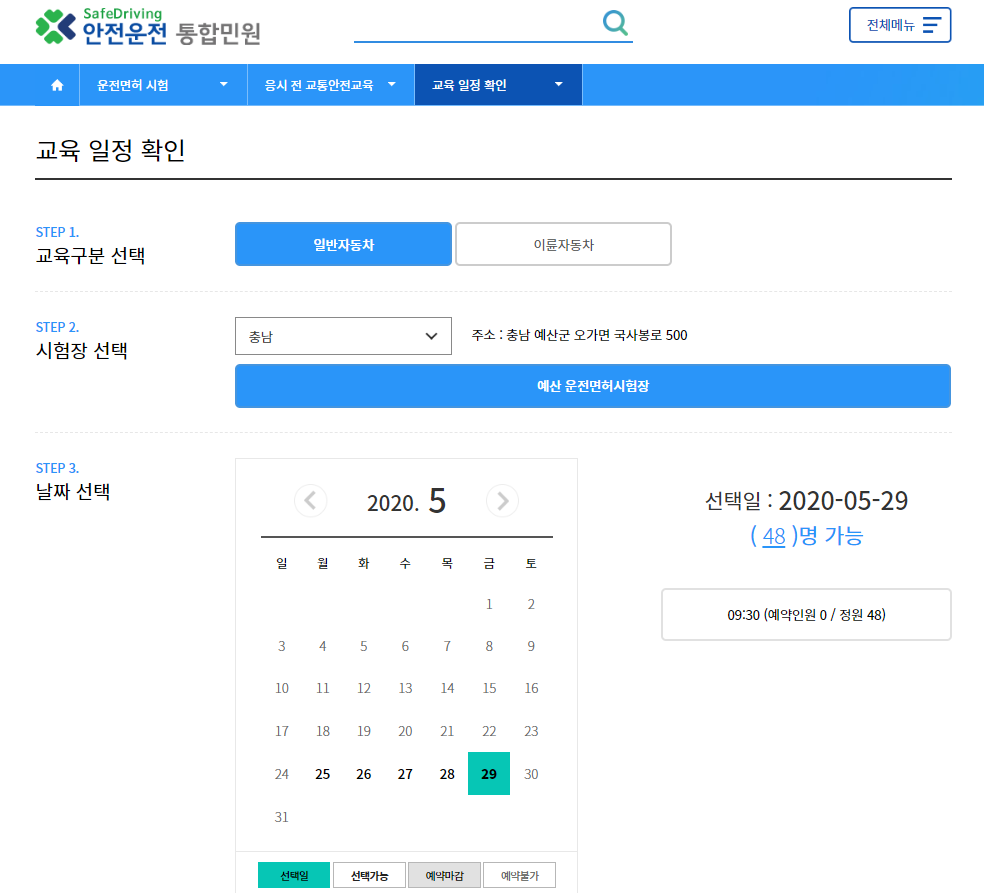 한 1-2년 전에 홈페이지 개편을 한 것 같아요. '안전운전 통합민원'이라는 사이트가 생겼고, 이곳에서 교통안전교육, 기능시험, 도로주행 예약이 모두 가능해요. 교육 구분, 시험장, 날짜 선택을 하면 그 시간에 가면 됩니다. 교육은 1시간 정도 시험장에 있는 교실에서 교통 안전관련 동영상 시청을 합니다.