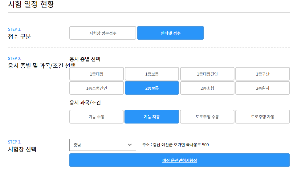 저는 예산 운전면허시험장에서 학과/기능/주행 시험을 응시했어요. 학과 시험을 합격한 날, 시험장 3층에서 시험을 보고 내려와서 1층에서 바로 기능 시험을 신청할 수도 있고, 집에서 안전운전 통합민원 사이트에서 온라인으로 접수해도 됩니다! 저는 온라인으로 접수했지만, 기능이나 주행은 경험해보니 예약이 쉽지 않더라구요. (특히 주행은 더욱더!!!) 그러니 최대한 빨리 예약하는 걸 추천해요!