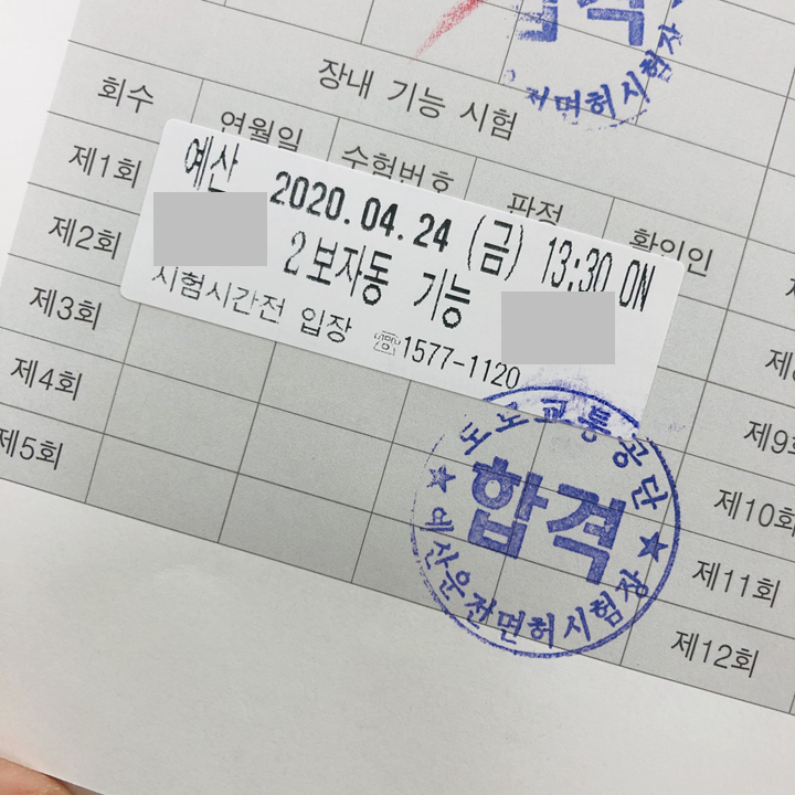 시험장에 도착해서 기능 시험 보는 곳에서 바로 대기했었는데, 아뿔싸 온라인으로 시험을 신청한 탓에 아래 사진에 있는 시험 번호가 적혀있는 스티커를 수령하지 않았어요. 기능 시험에 대해서 설명을 다 듣고 나서 시험을 응시할 시간이 되어서 스티커가 없다는 사실을 알고 당황했어요. 그렇지만 그곳에 계신 선생님이 시험장 1층에 가서 스티커를 빨리 받아오라고 하셔서 스티커를 받으러 다녀왔어요. 시험장 1층에서 바로 예약하면 스티커를 받게 되는데, 온라인으로 신청한 경우에는 시험장에서 대기하기 전에 반드시 1층에 있는 데스크에 가서 스티커를 수령하는 것 잊지 마세요!