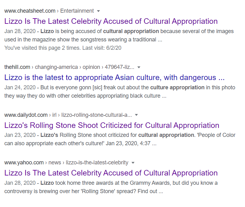 친구와 이야기를 나누다가 생소한 개념에 대해 들었다. 대화의 맥락은 이러했다. 최근에 난 Lizzo라는 가수의 노래('Juice'와 'Good as Hell')를 관심 있게 듣고 있었고, 친구도 그랬다고 한다. 그런데 흑인인 Lizzo가 아시아 계열의 옷을 입고, 장식을 두르고 찍은 사진에 대해서 꽤 많은 사람들이 불편해했다고 하며, 'Cultural Appropriation'이라는 개념에 대해 말해주었다. 1월 초에는 그와 관련된 기사가 여럿 발행되었다.