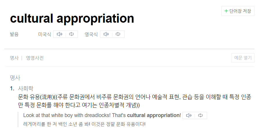 그래서 'appropriate'의 뜻을 좀 더 파보기로 했다. 사실 처음에 딱 생각나는 뜻은 '적절한'인데, '도용하다' '제 것으로 만들다'와 같은 뜻도 가지고 있다. '유용'보다는 좀 더 뜻을 이해할 것만 같다. 문화적 전유는 결국 특정 문화권의 문화를 가져가서 제 것인 양 만든 것에 대해 불편한 감정을 느끼는 것에 대한 것이다. 흔한 예시로는 네이버 사전에 적힌 백인이 레게머리를 한 것이 있다. 그래서 영어로는 어떻게 표현되는지 살펴봤다.