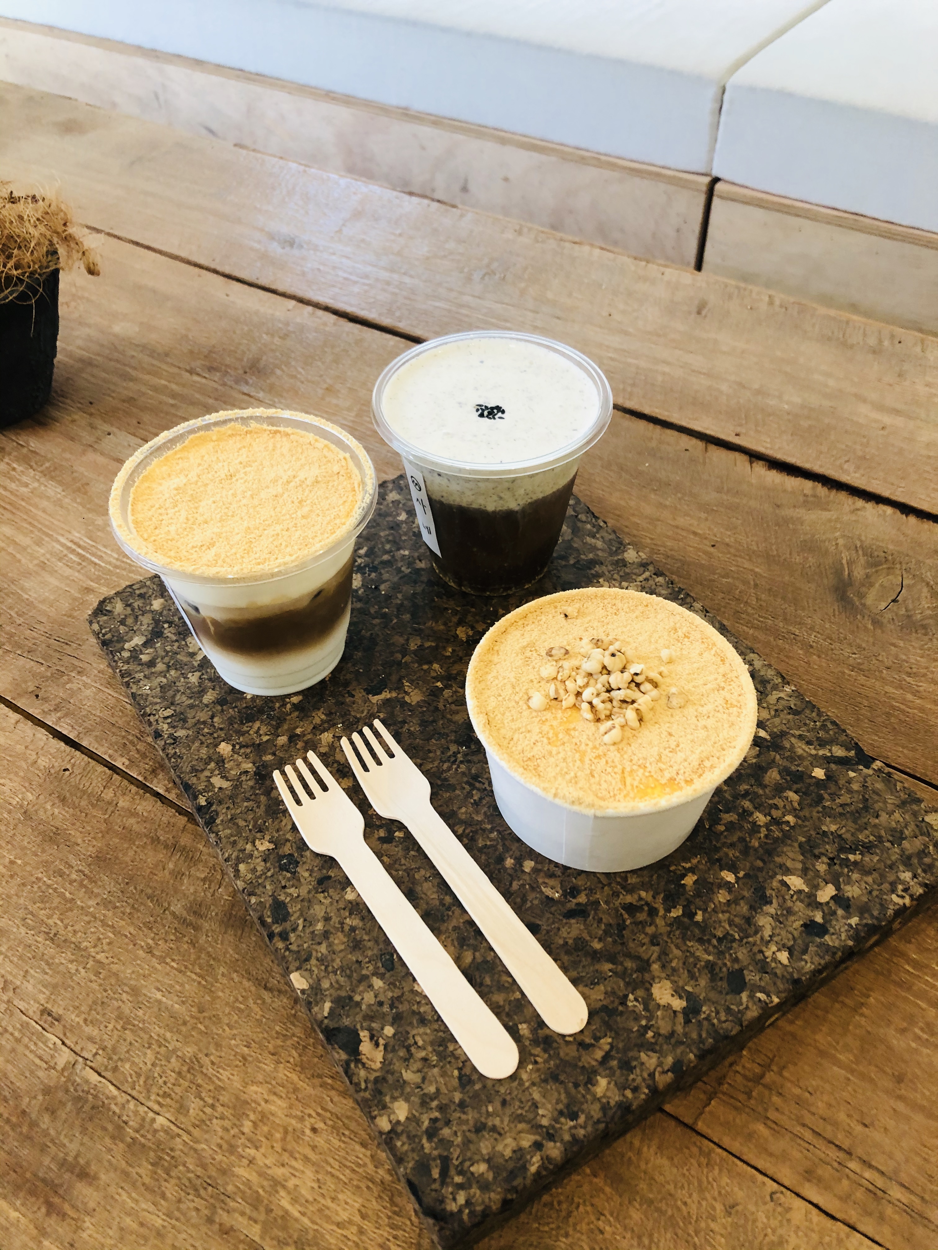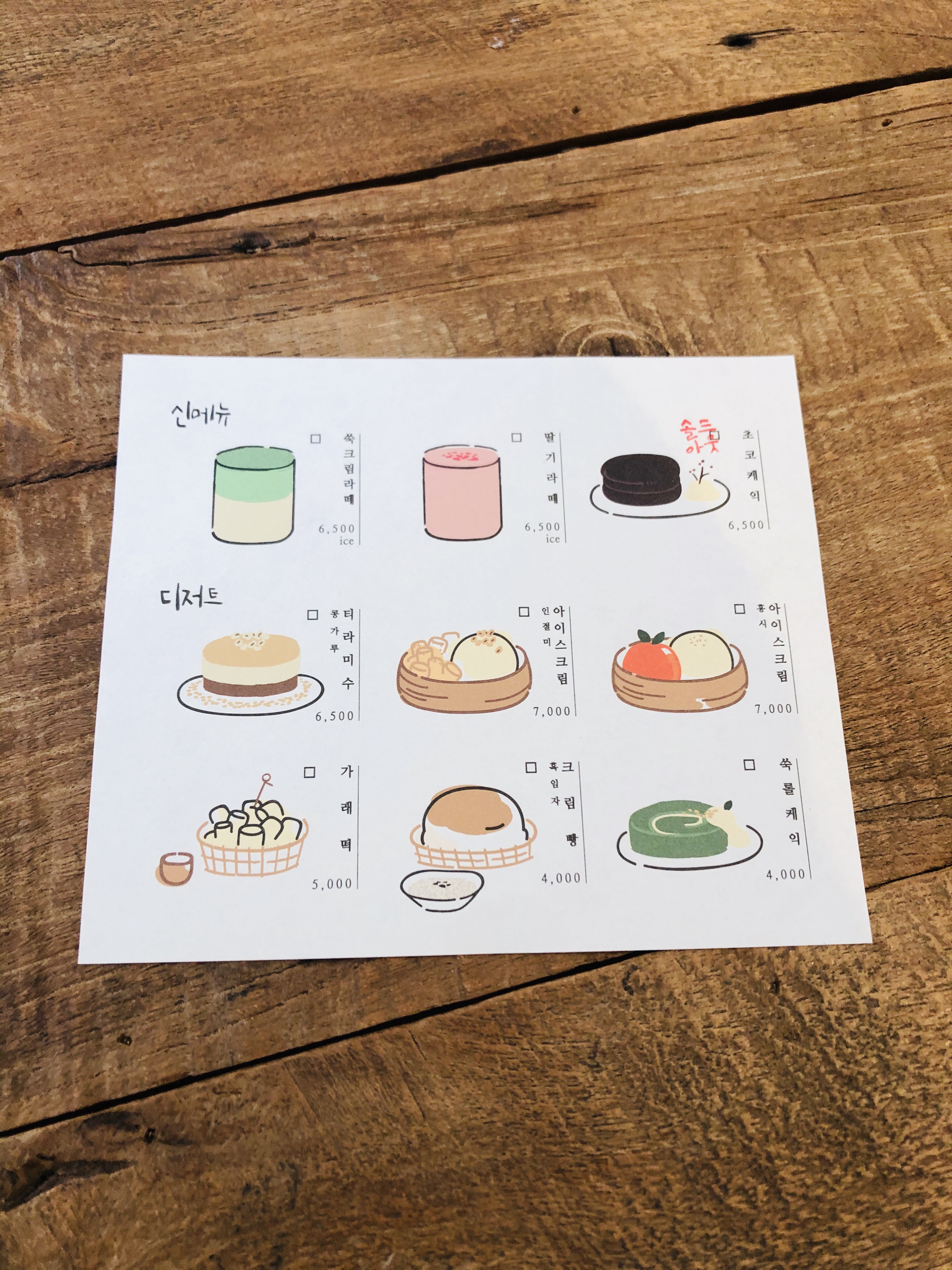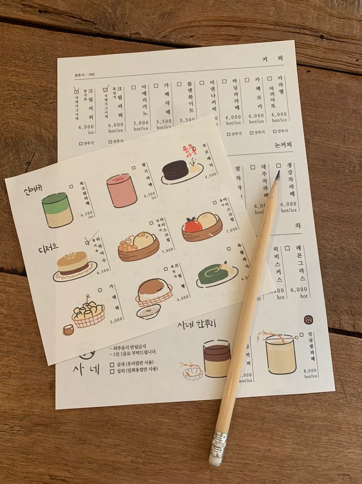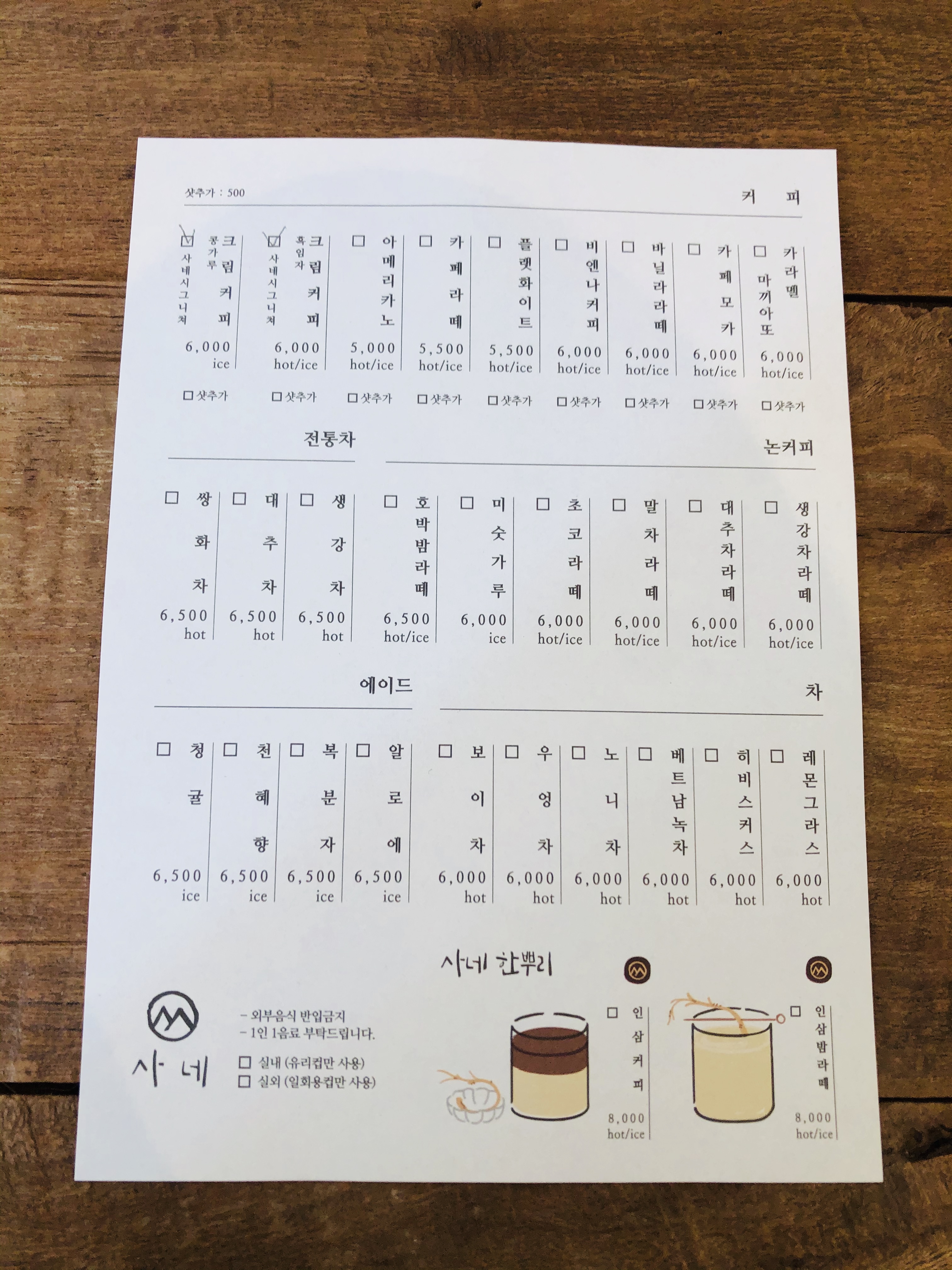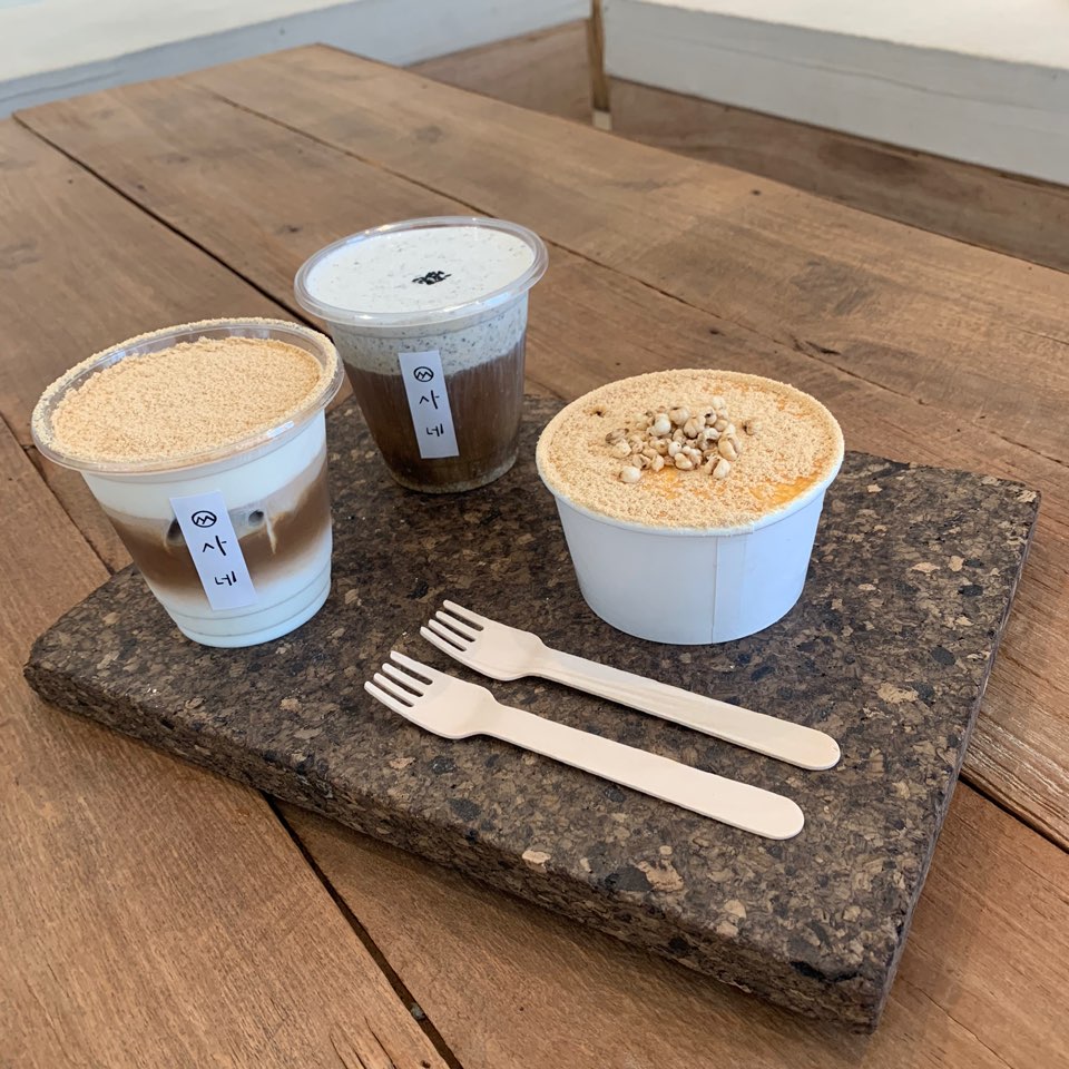 메뉴판이 종이로 나오고 주문을 할 수 있게 되어 있는데, 너무 귀여웠어요. 저는 새로운 카페에 가면 아메리카노 아니면 시그니처 커피를 주로 마시는데요. 사네는 흑임자 크림 커피, 콩가루 크림 커피가 시그니처고 인삼을 베이스로 한 커피도 있었어요. 저희는 흑임자 크림 커피, 콩가루 크림 커피, 콩가루 티라미수를 주문했어요.