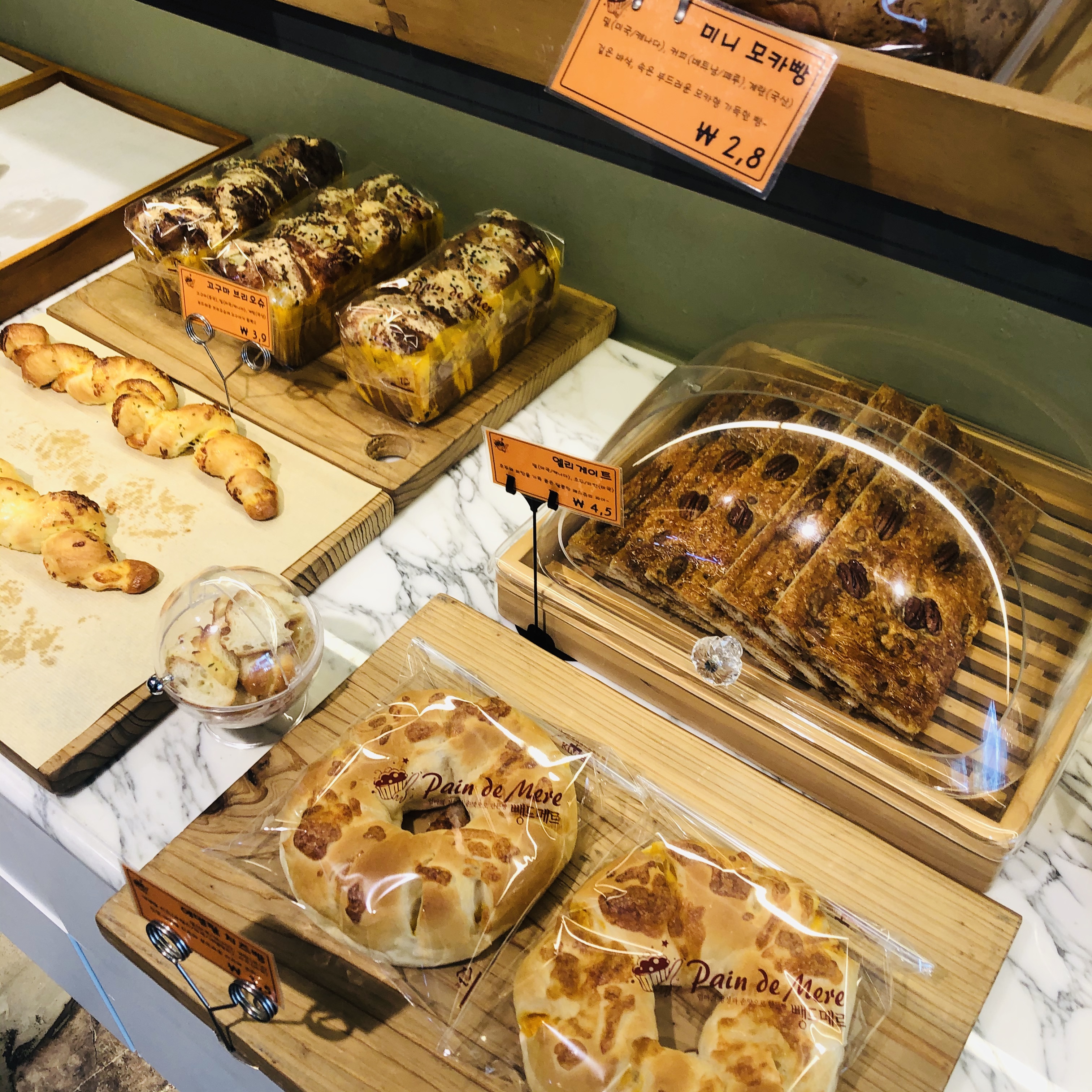 아산에서 지내게 된 이후로 서울 느낌 나는 베이커리가 없나 하고 인스타그램을 뒤적였어요. 아산 시내나 신정호 쪽에는 도무지 마음에 드는 베이커리가 없었거든요. 바질에 크림치즈 들어간 빵을 먹고 싶었는데, 찾을 수가 없었어요. 사진으로 볼 때 오! 여기 괜찮아 보이는데 싶었던 곳이 있었는데 바로 뺑드메르였어요. 배방은 좀 멀어서 차를 타야해서 가려고 마음먹은 지 몇 주 만에 방문했네요.