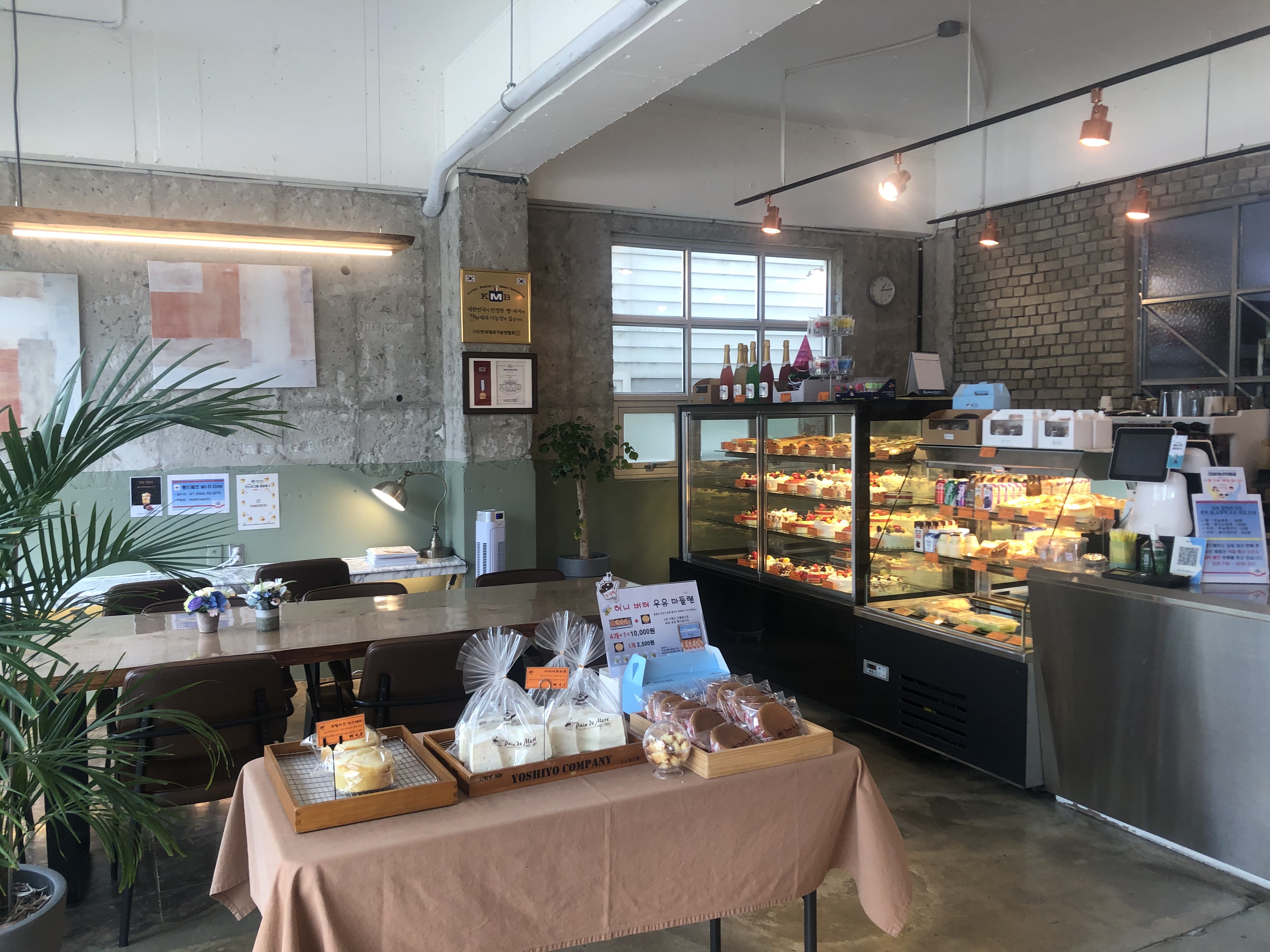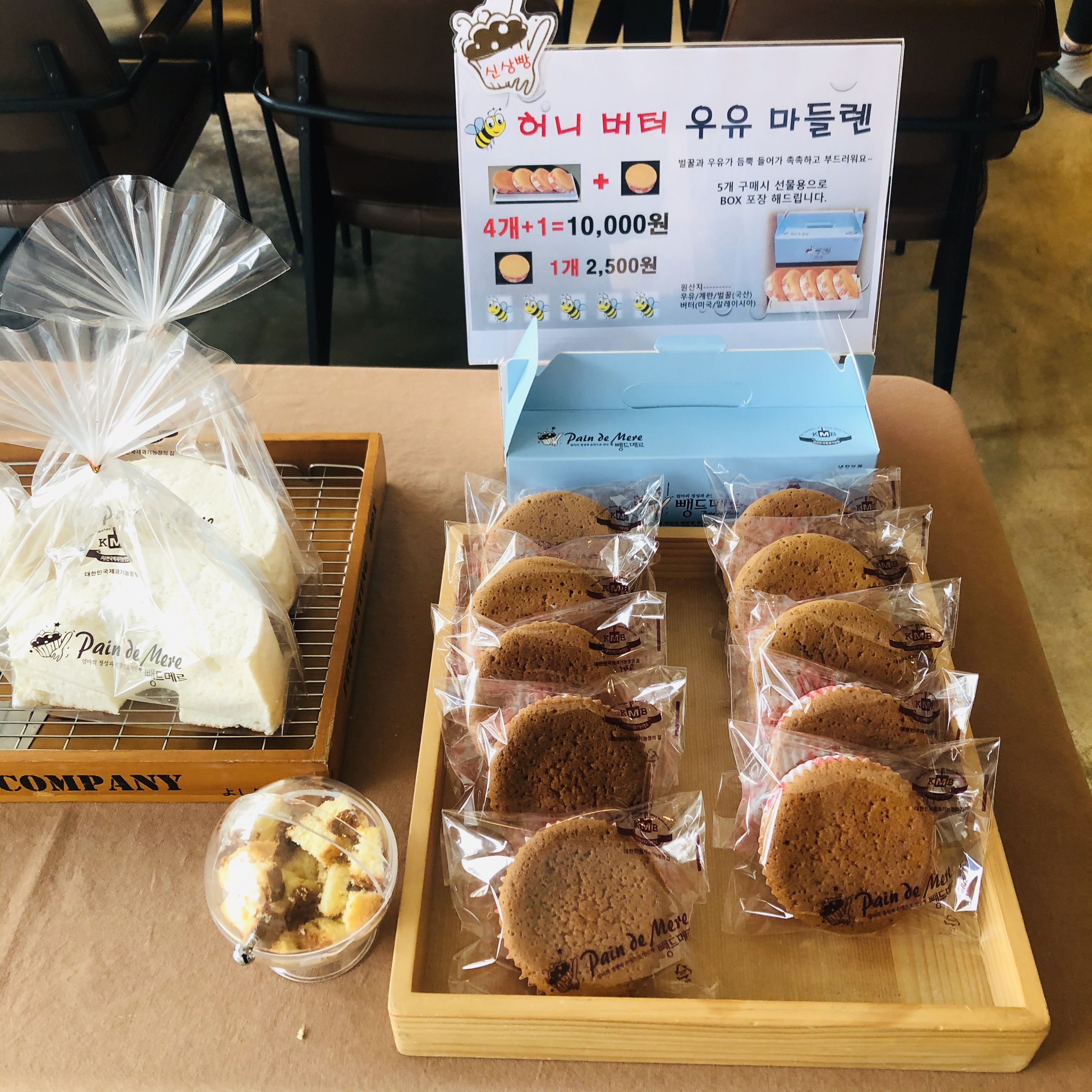 주차 공간은 4-6대 정도 가능하고, 빵이 있다 보니 반려동물 출입 금지예요. 제가 좋아하는 바질 크림 바게트도 팔고, 다이어트 시폰이나 우유 마들렌 같은 게 유명한 것 같아요. 다른 가족들은 찹쌀 빵이나 크렌베리 빵 등을 맛있게 먹었어요!