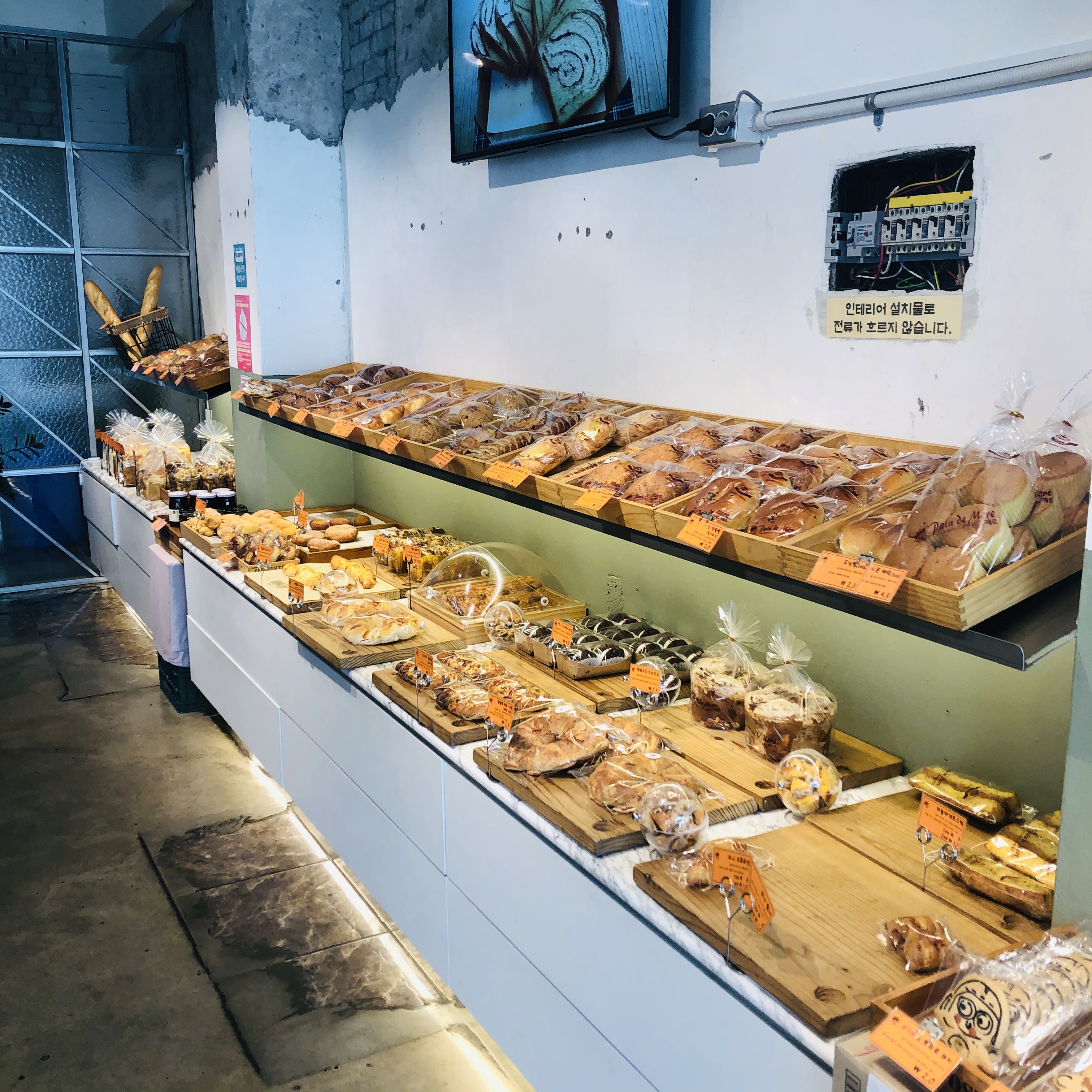 베이커리 내부 디자인은 construction site(공사장) 같은 느낌으로 합정의 엔트러사이트 같은 느낌이 살짝 있었어요. 빵의 종류도 다양하고 매일매일 갓 구운 빵을 판매한다고 해요!
