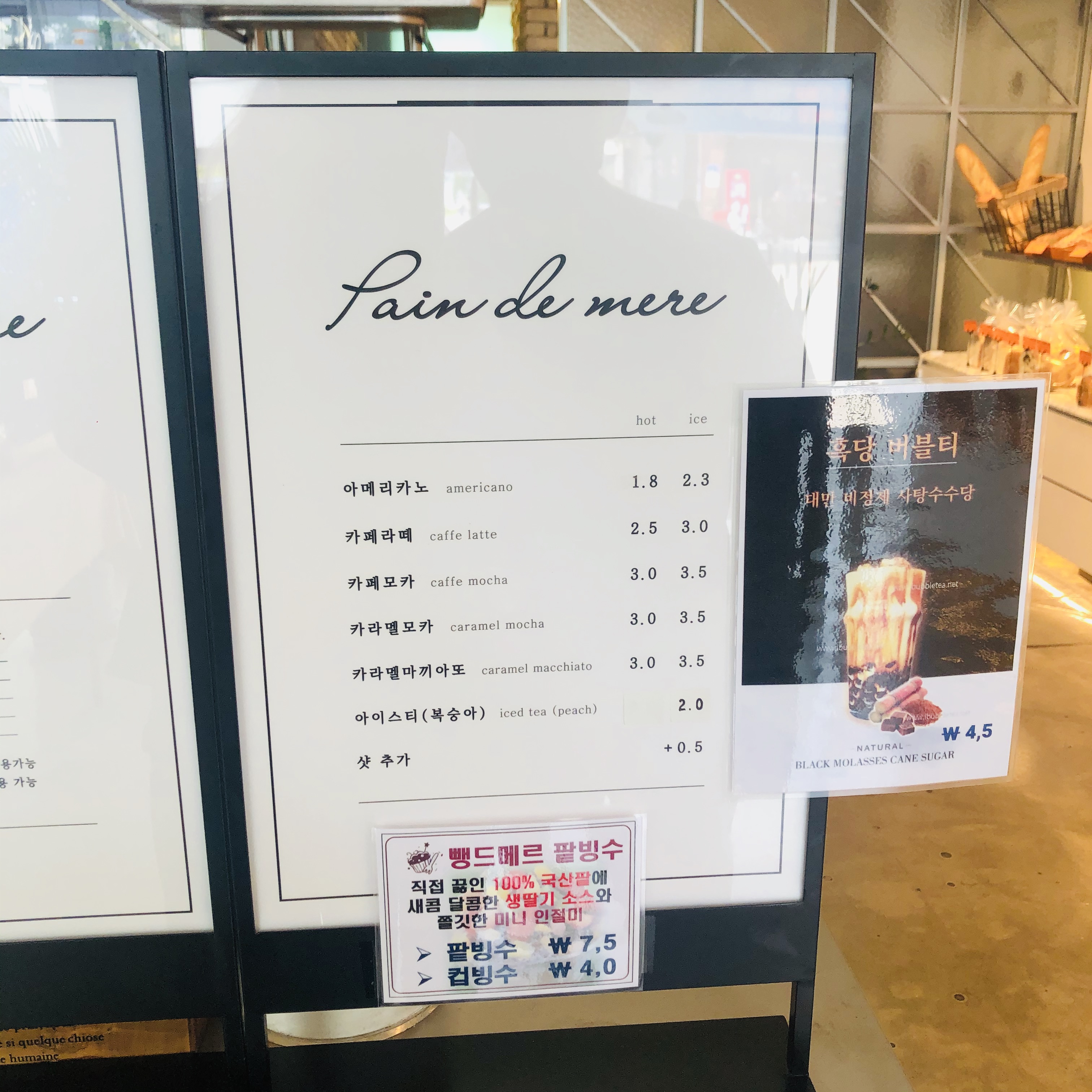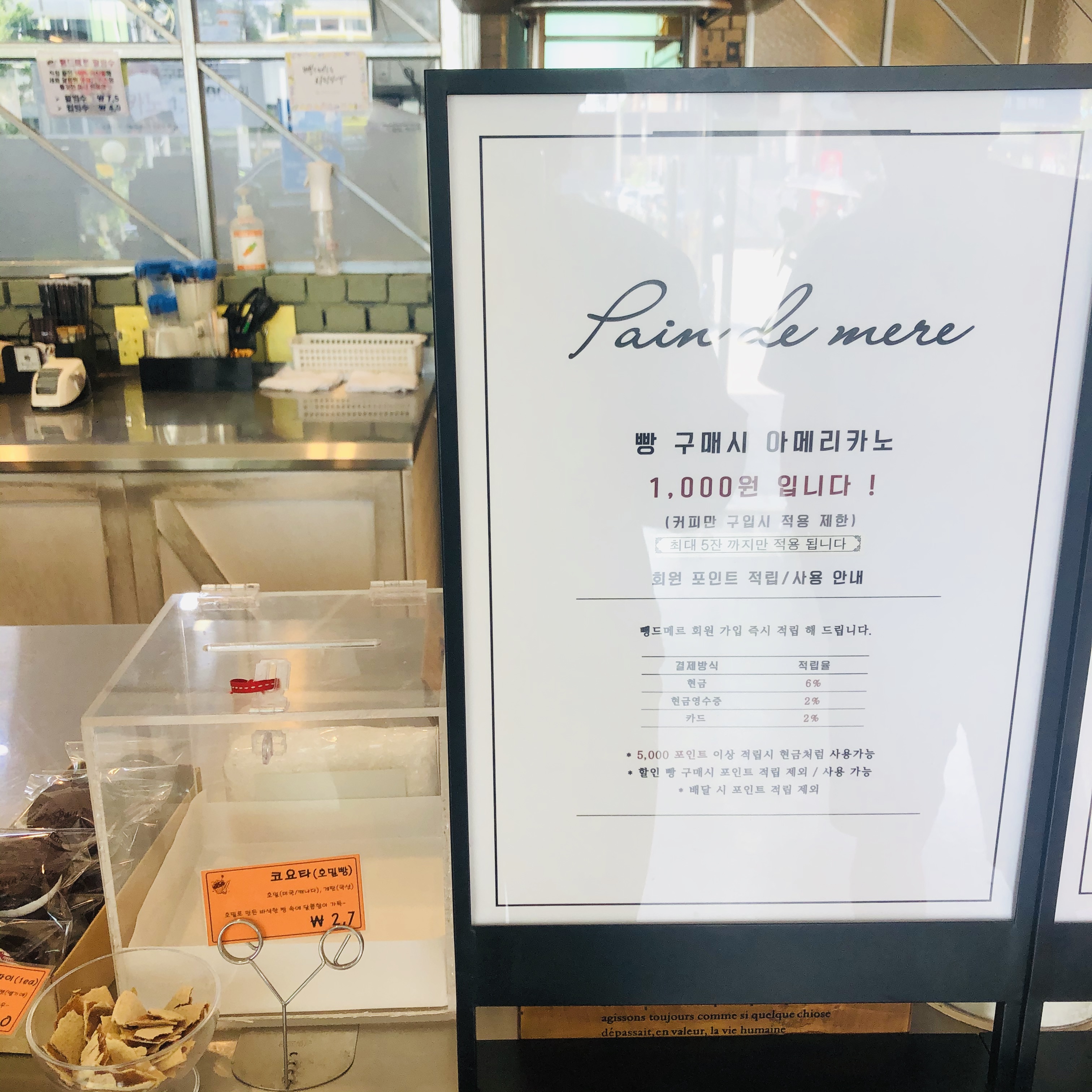 저는 첫 번째와 이번에 두 번째 방문했을 때 빵을 굉장히 많이 사서 포장했는데요. 빵 구매시 아메리카노가 1000원이라고 해서 테이크 아웃해서 갔어요. 아메리카노 할인받으니 기분이 좋더라고요! 여름이라 흑당 버블티와 팥빙수도 파는 것 같아요. 그렇지만 1000원짜리 아메리카노가 저렴해서 저는 좋네요!