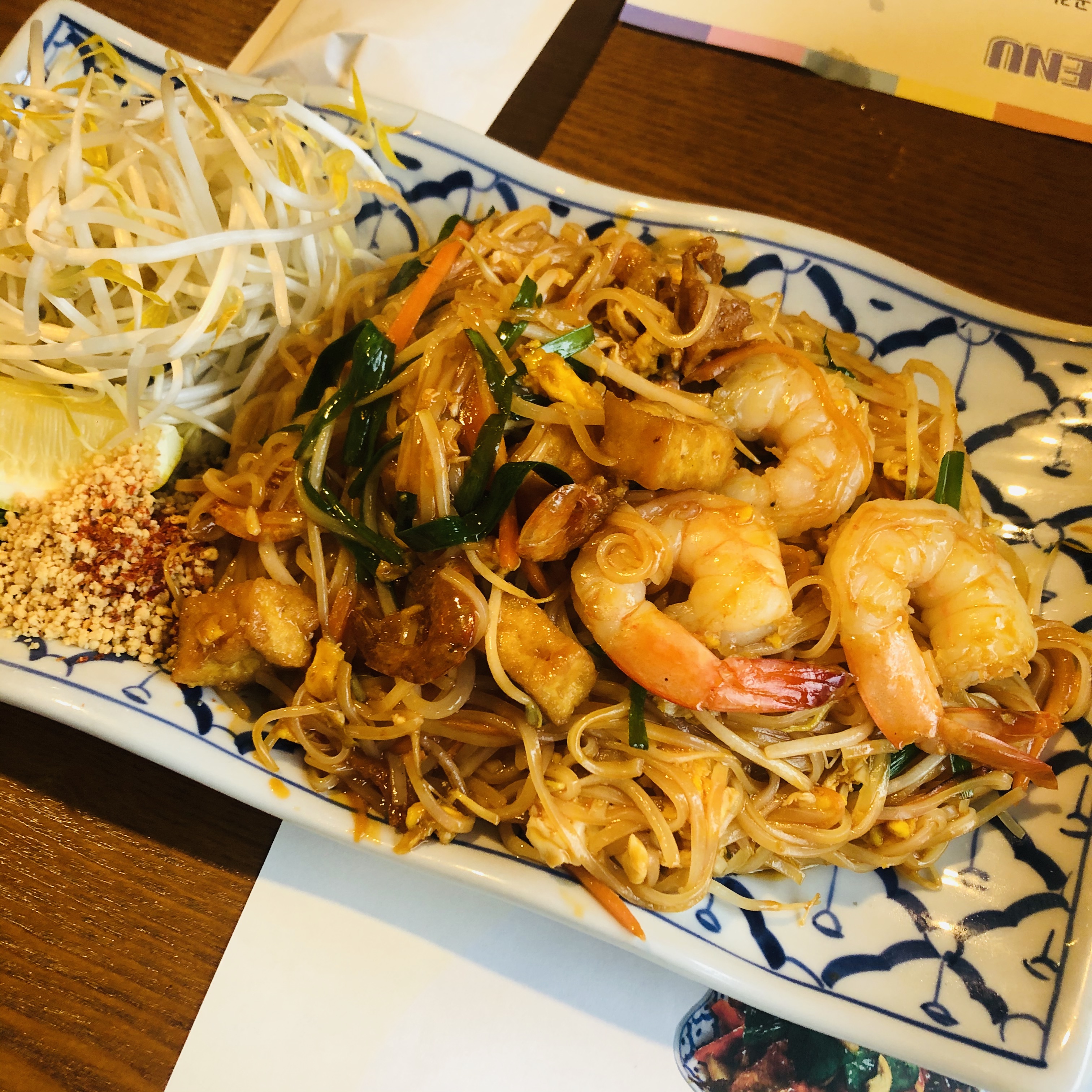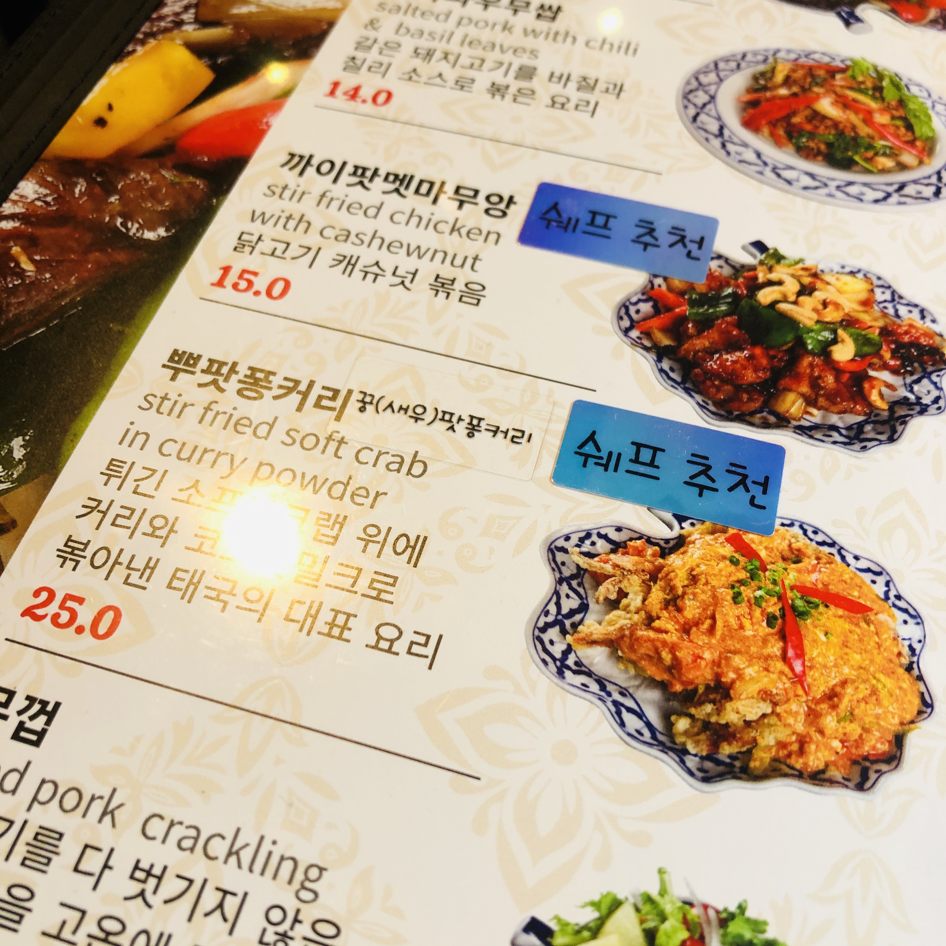 제가 먼저 약속 장소에 도착해서 창가 자리에 앉아 메뉴를 정독했어요. 추천 메뉴에는 '쉐프 추천'이라고 적혀있었어요. 저녁 시간에 방문한 거라 저렴한 가격의 런치 세트를 먹을 수 없어서 너무 아쉬웠어요. 팟타이, 똠얌꿍, 뿌팟퐁커리, 나시고랭 등 추천 메뉴가 많아서 두 개의 메뉴만 고르기 너무 아쉬웠어요. 결국 가장 먹고 싶었던 팟타이와 비 오는 날 딱 좋은 똠얌꿍을 주문했어요. 과식하고 배탈 나기 싫어서 두 개의 메뉴만 주문했는데, 결국 아쉬워서 나시고랭도 추가로 주문했어요!