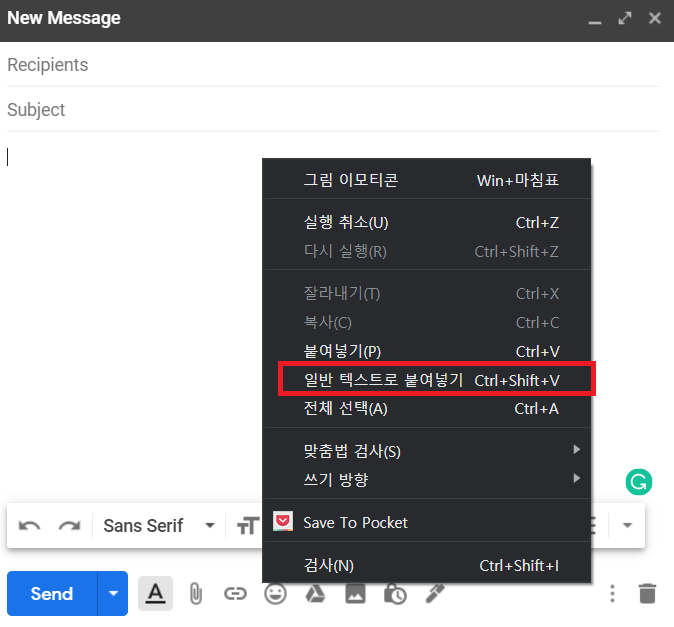 2) 지메일 복붙 시 '일반 텍스트로 붙여 넣기'
