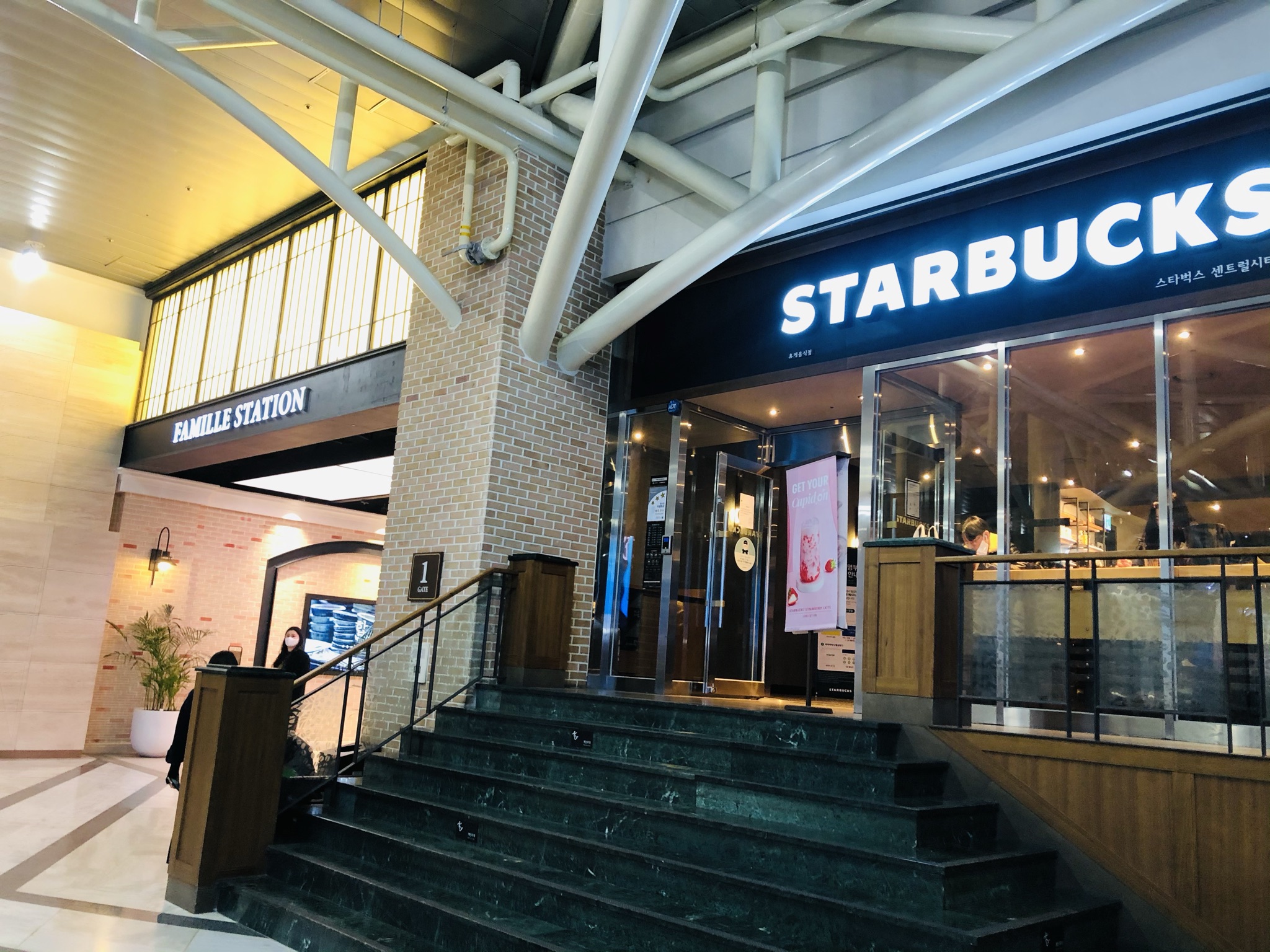파미에 스테이션 옆에 스타벅스가 있고, 이쪽은 13번 정류장 쪽이에요. 파미에 스테이션 입구로 들어가지 마시고 오른쪽에 보시면 아웃백으로 가는 화살표가 보여요. 딤딤섬은 아웃백과 함께 구석진 곳 2층에 들어가는 입구가 따로 있어서, 아웃백 입구로 가시는게 편해요.