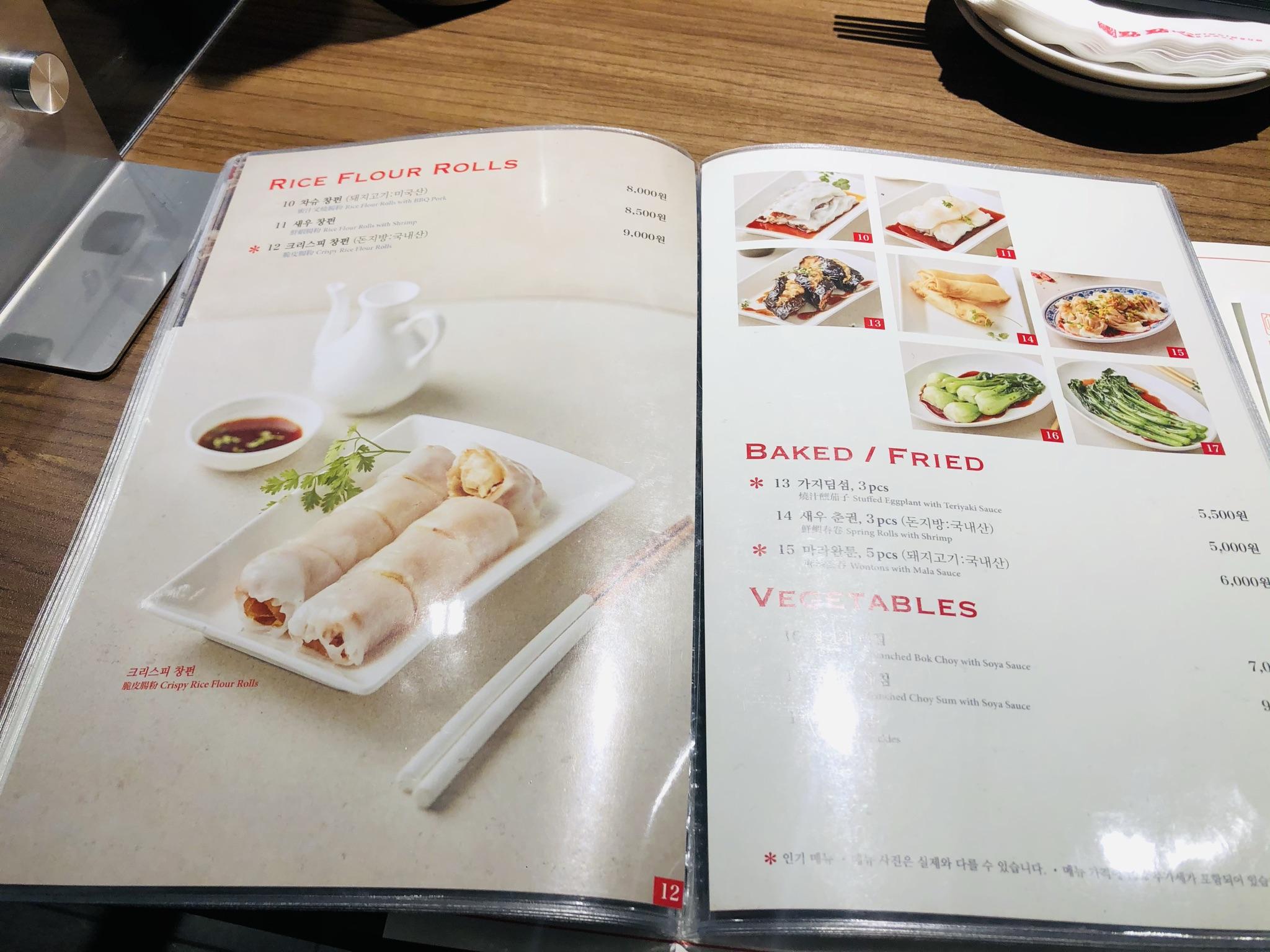 먼저 들어가자마자 메뉴를 살펴봤어요. 제가 좋아하는 크리스피 창펀 (안에는 새우가 들어있어요), 친구 최애 메뉴 가지 딤섬, 그리고 제가 최근에 궁금했던 char siew noodle (돼지고기 차슈 로미엔)도 주문했습니다. 중국생활을 함께 했던 친구라 고량주도 작은 거 한병 시켜서 즐거운 시간을 보냈네요!