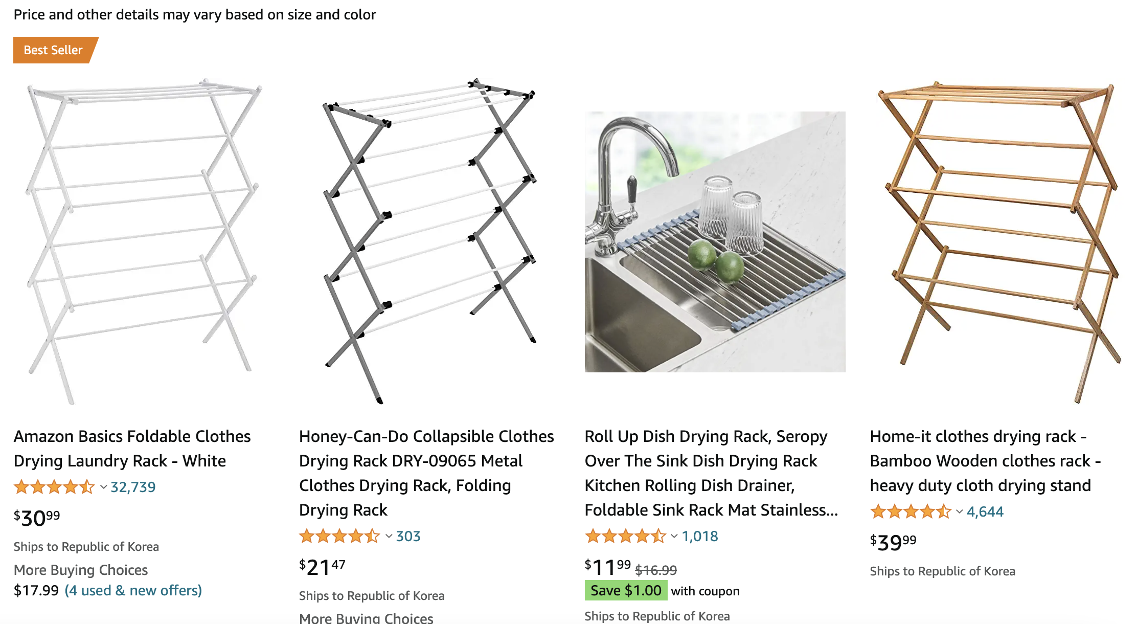 아마존 쇼핑몰에서도 한 번 검색해봤는데요, 빨래 건조대로는 Clothes Drying Rack이 자주 쓰이는 것 같아요!